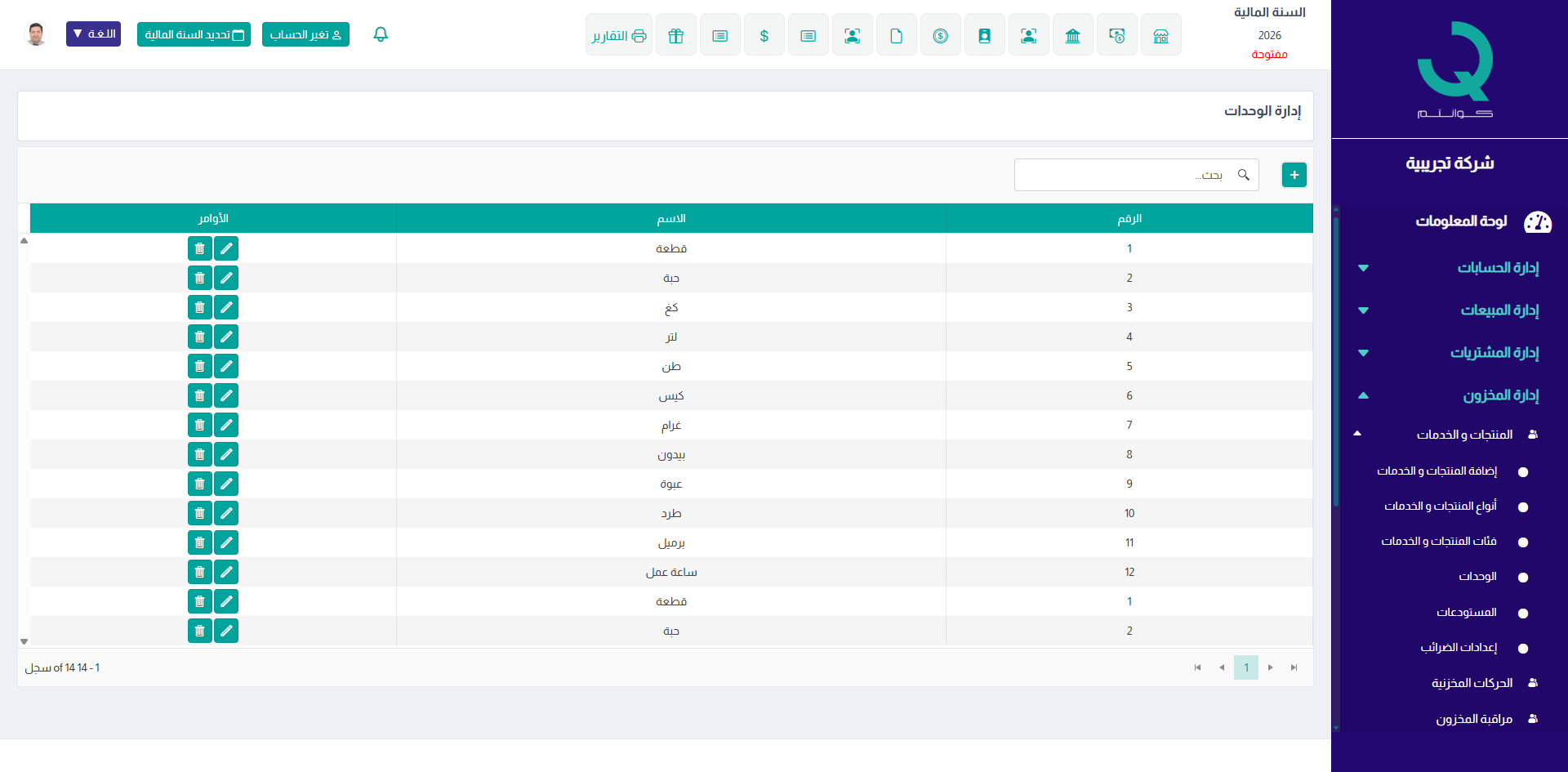 - حذف: لحذف الوحدة في حال عدم ارتباطها بمنتجات.