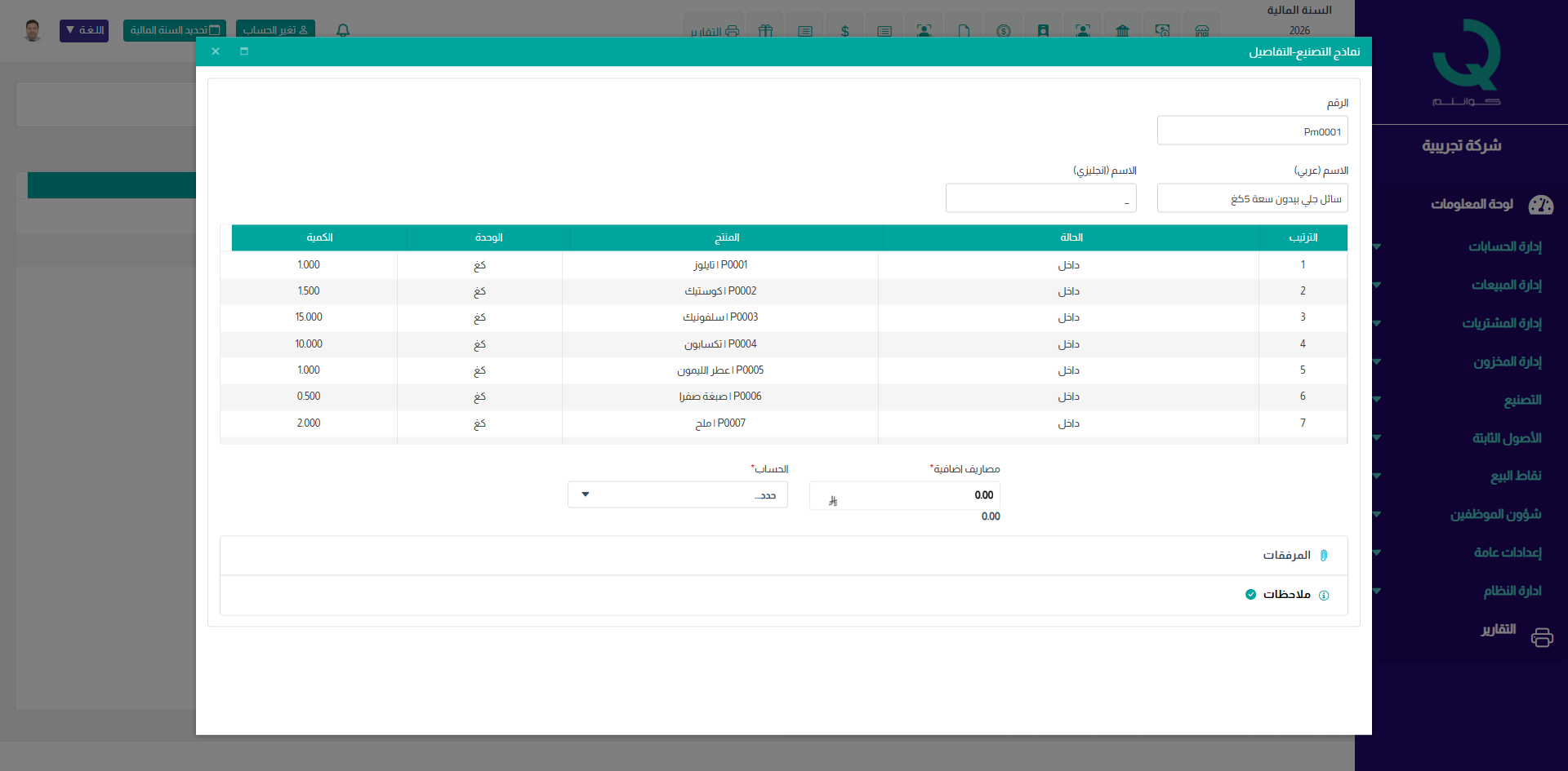 بعد إدخال جميع البيانات والمكونات، اضغط على حفظ لاعتماد نموذج التصنيع.