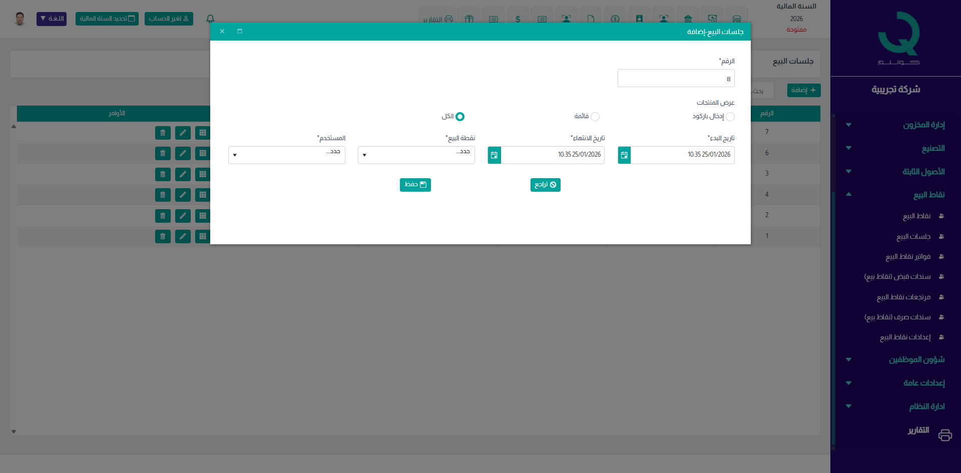 لفتح جلسة بيع جديدة، يتم الضغط على زر إضافة ثم اختيار نقطة البيع والمستخدم المسؤول.