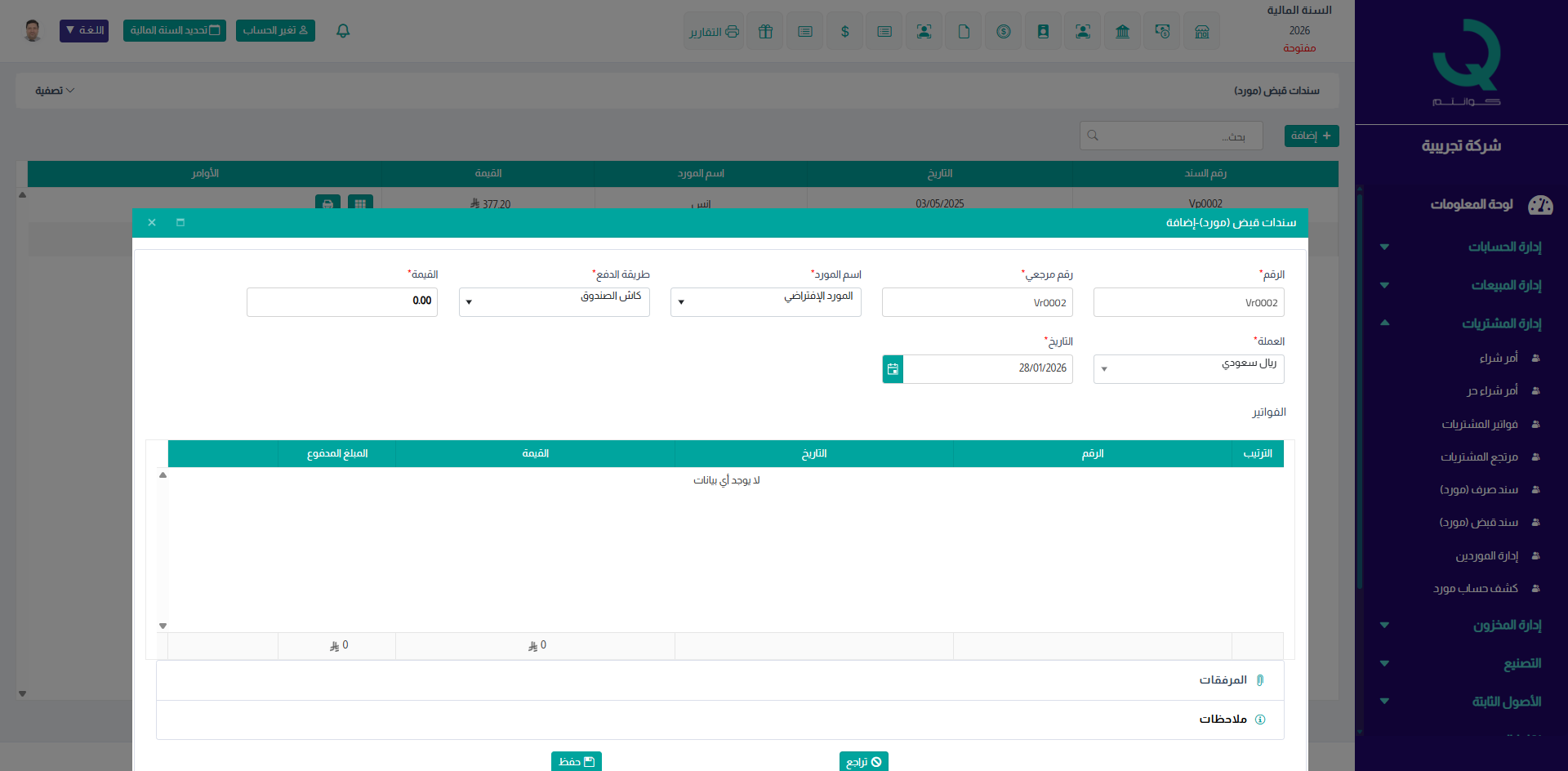 تُستخدم شاشة سند قبض (مورد) في نظام كوانتم ERP لتسجيل المبالغ المستلمة من الموردين، سواء كانت تسوية لفواتير مشتريات أو دفعات مستقلة، مع التأثير المباشر على الحسابات.