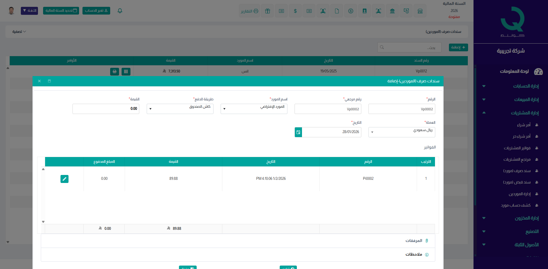 تُستخدم شاشة سند صرف (مورد) في نظام كوانتم ERP لتسجيل المبالغ التي يتم دفعها للموردين، سواء كانت سداد فواتير مشتريات أو مصروفات مباشرة مرتبطة بالمورد.