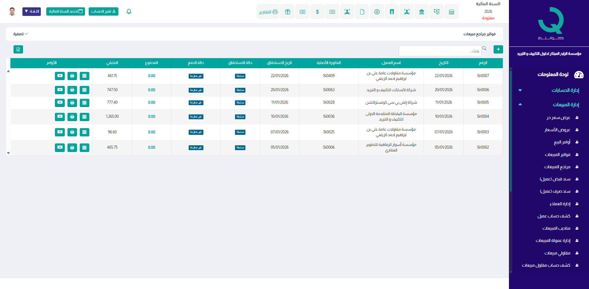 تُستخدم شاشة مرتجع المبيعات في نظام كوانتم ERP لتسجيل مرتجعات العملاء سواء المرتبطة بفواتير مبيعات سابقة أو مرتجعات مباشرة، مع تحديث الحسابات والمخزون حسب نوع المرتجع.