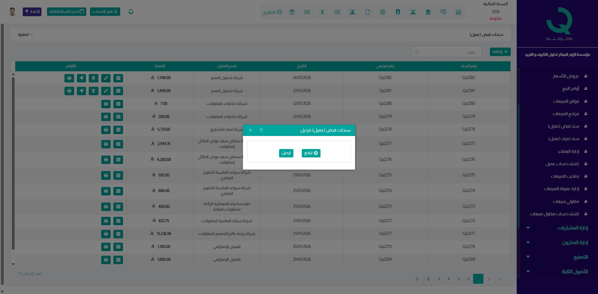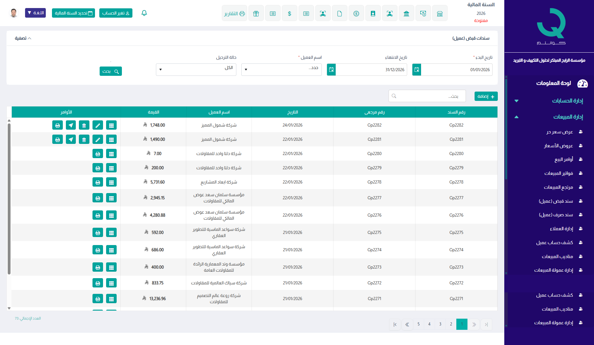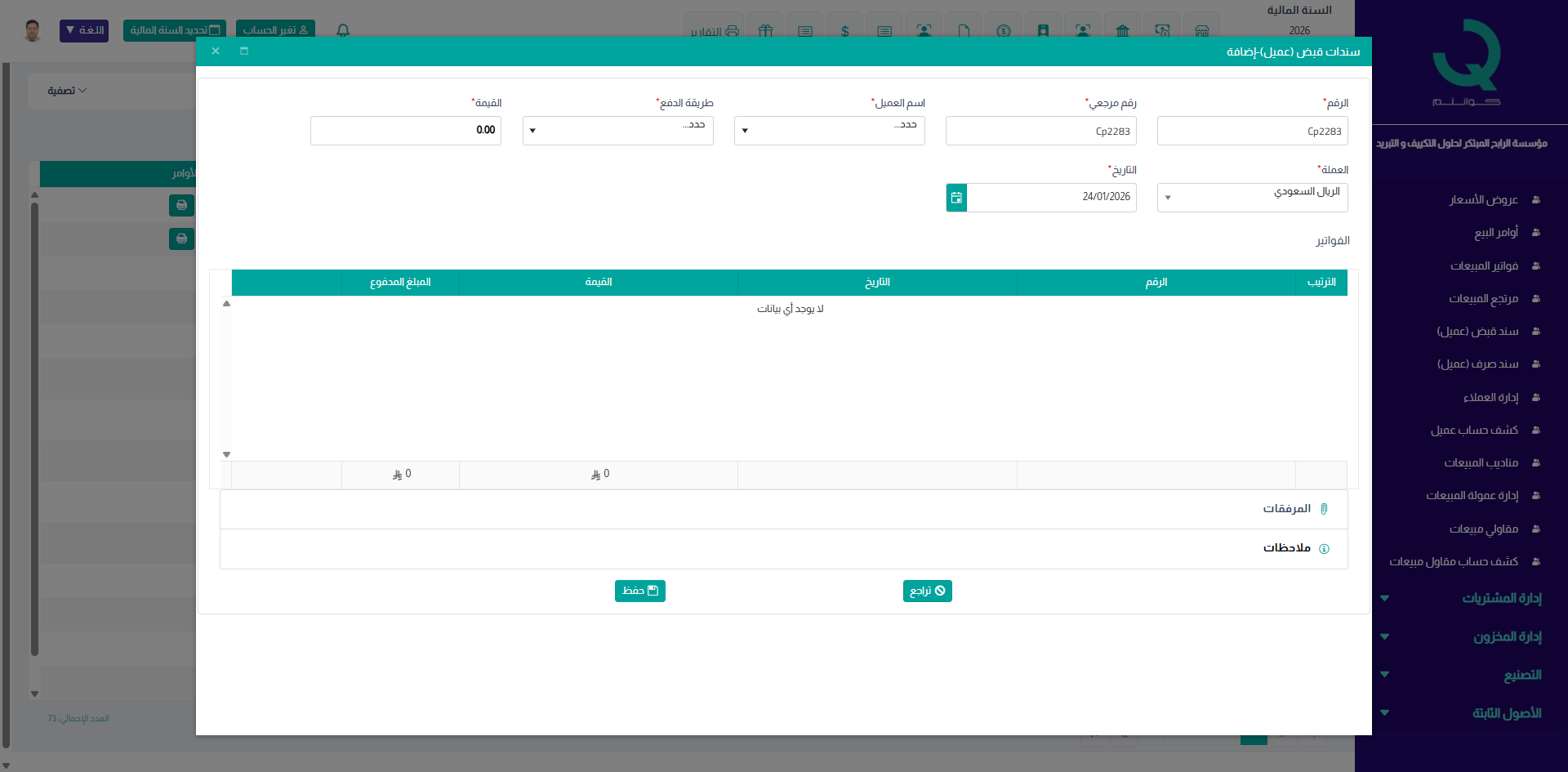 تُستخدم شاشة سند قبض (عميل) في نظام كوانتم ERP لتسجيل المبالغ المحصلة من العملاء نقدًا أو عبر وسائل الدفع المختلفة، مع ربطها بحساب العميل وترحيلها محاسبيًا.