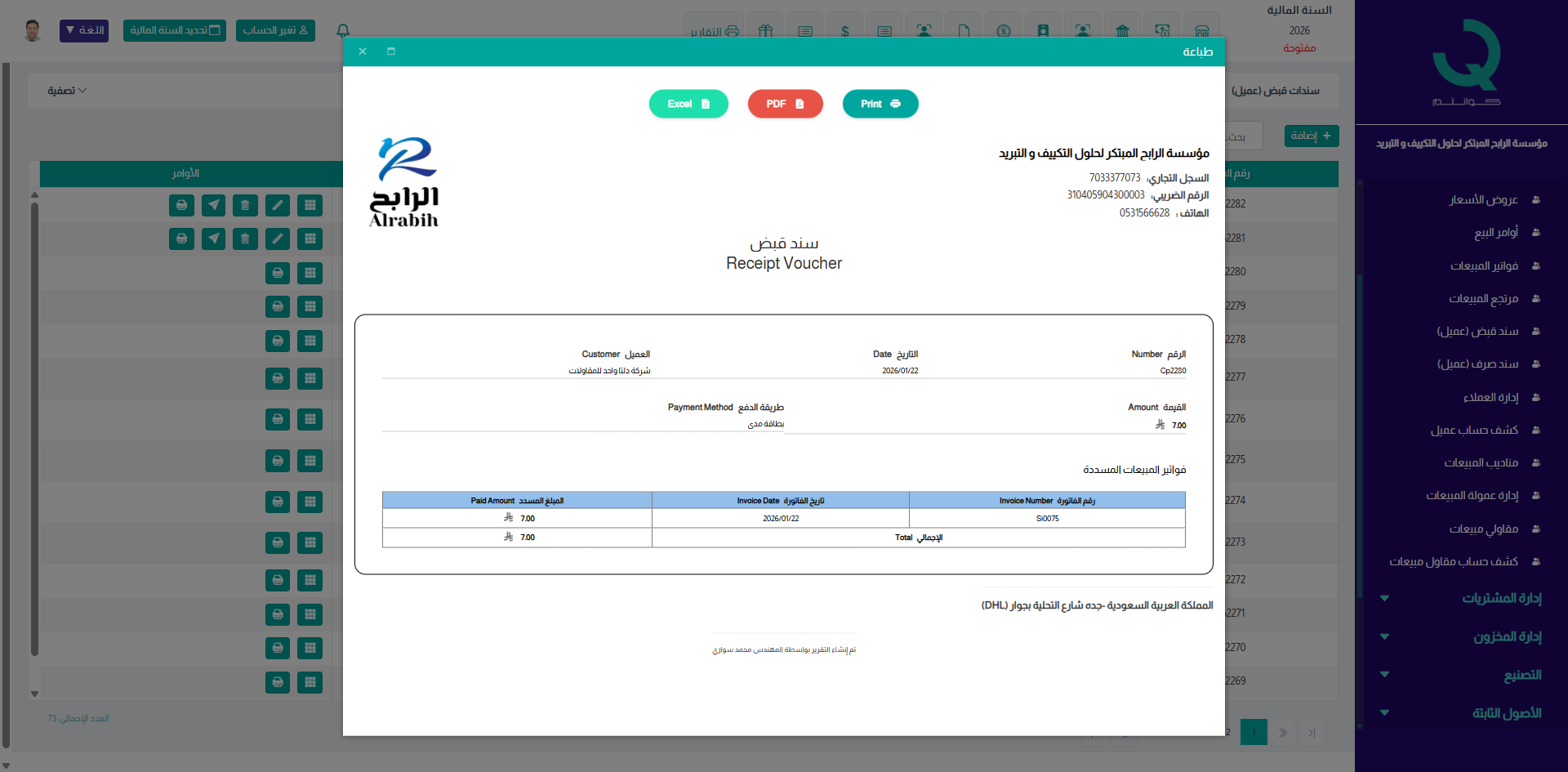 يمكن طباعة سند القبض باستخدام زر طباعة، حيث يتم إنشاء نموذج رسمي يحتوي على بيانات العميل والمبلغ وطريقة الدفع.