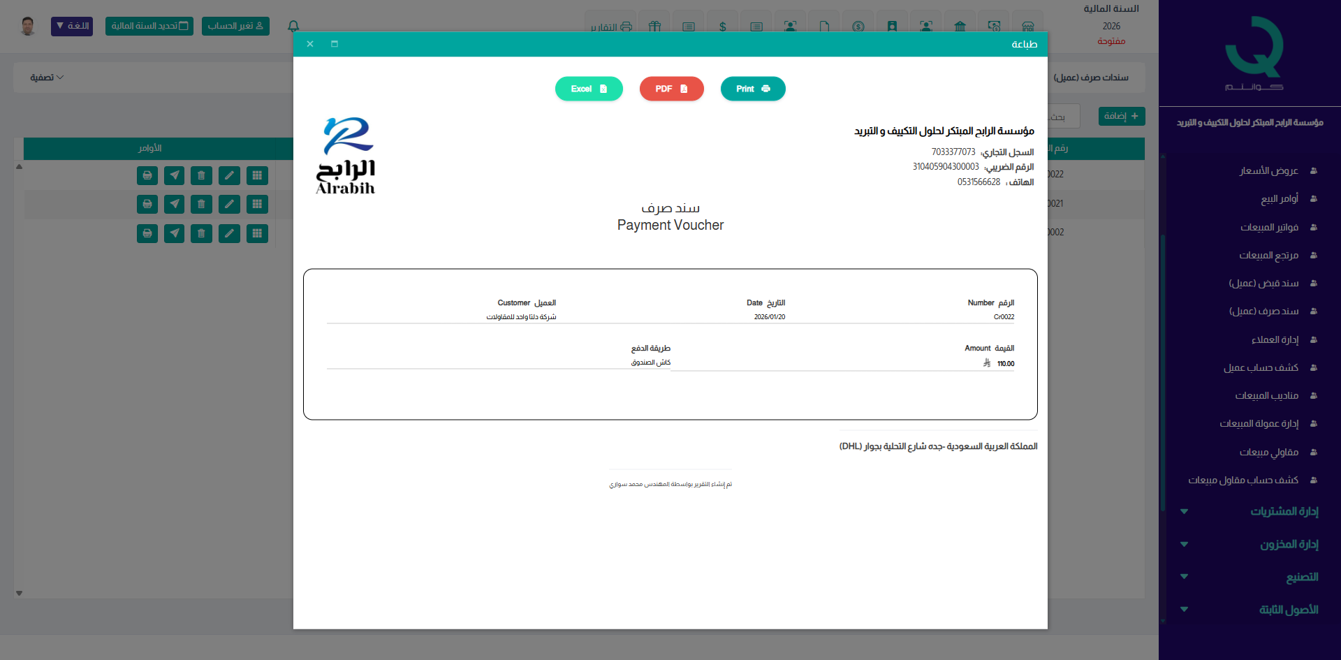 يمكن طباعة سند الصرف باستخدام زر طباعة، حيث يتم إنشاء نموذج رسمي يحتوي على بيانات العميل وقيمة الصرف وطريقته.