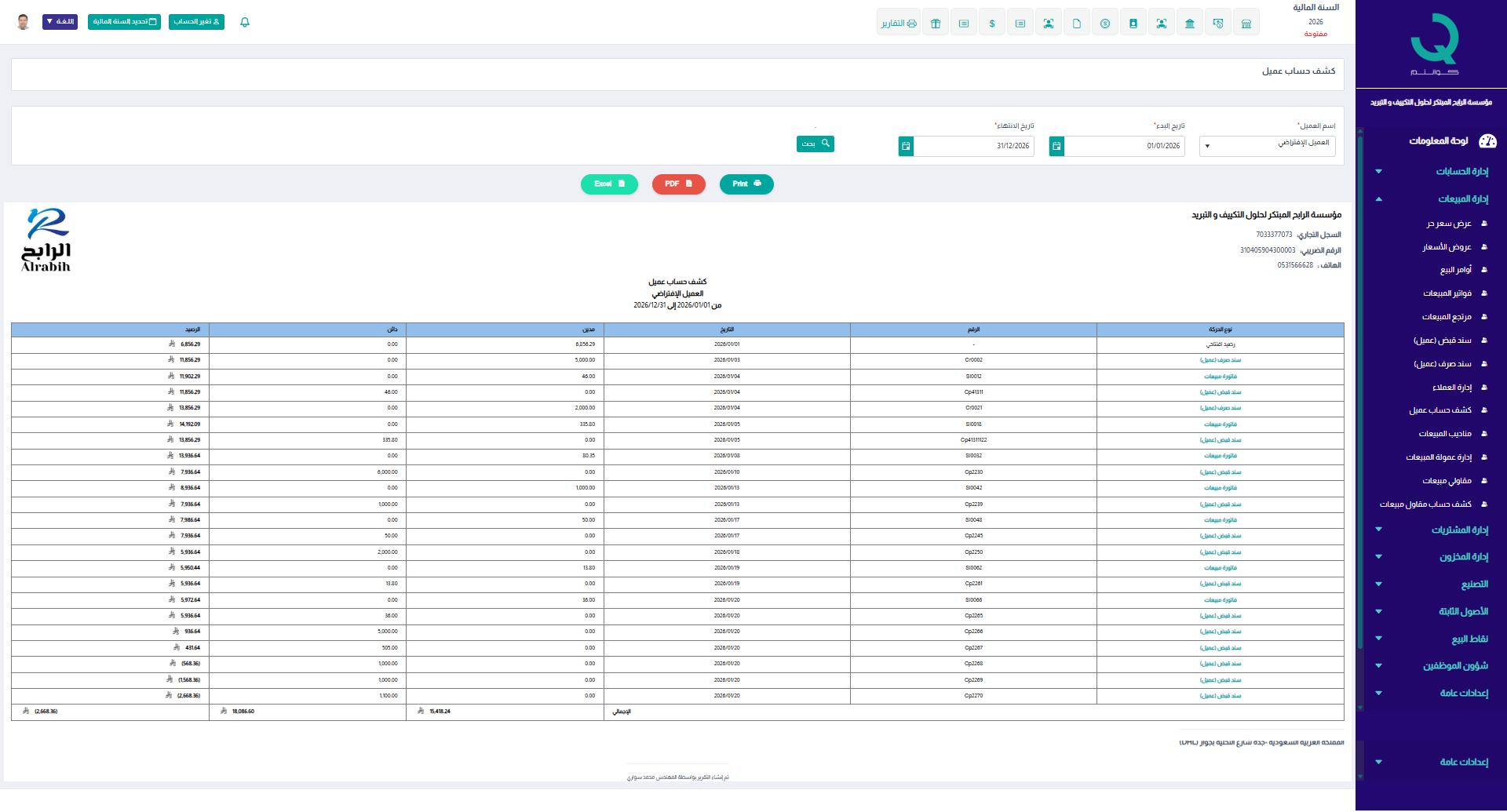 يتيح النظام تصدير كشف الحساب إلى ملف PDF أو Excel لاستخدامه في المراجعة أو الإرسال للعميل.