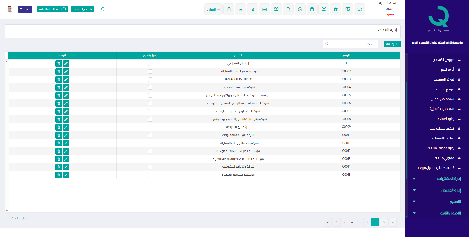 تُستخدم شاشة إدارة العملاء في نظام كوانتم ERP لإضافة وتعديل وإدارة بيانات العملاء، وربطهم بالحسابات المالية ومتابعة تعاملاتهم داخل النظام.