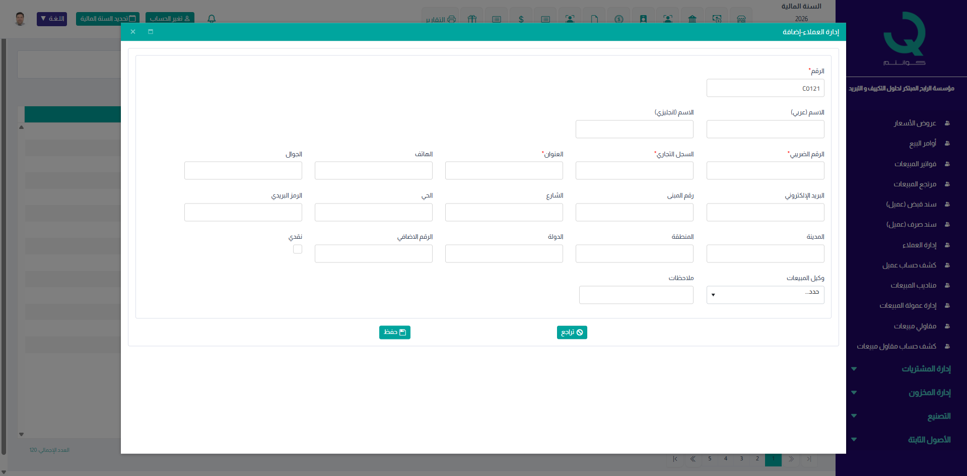 بعد إدخال جميع البيانات، اضغط على حفظ لتسجيل العميل، أو تراجع لإلغاء العملية.