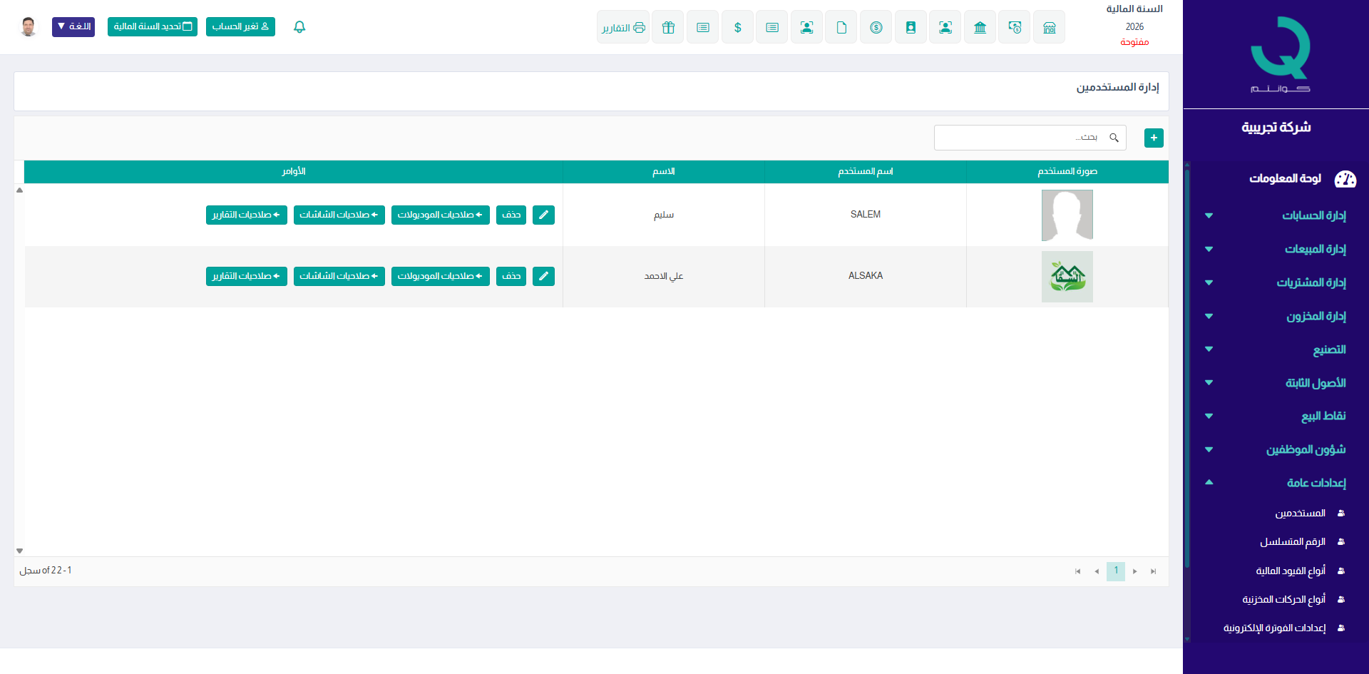 تتيح شاشة إدارة المستخدمين التحكم الكامل في حسابات مستخدمي النظام، من حيث الإنشاء والتعديل وتحديد الصلاحيات بدقة.