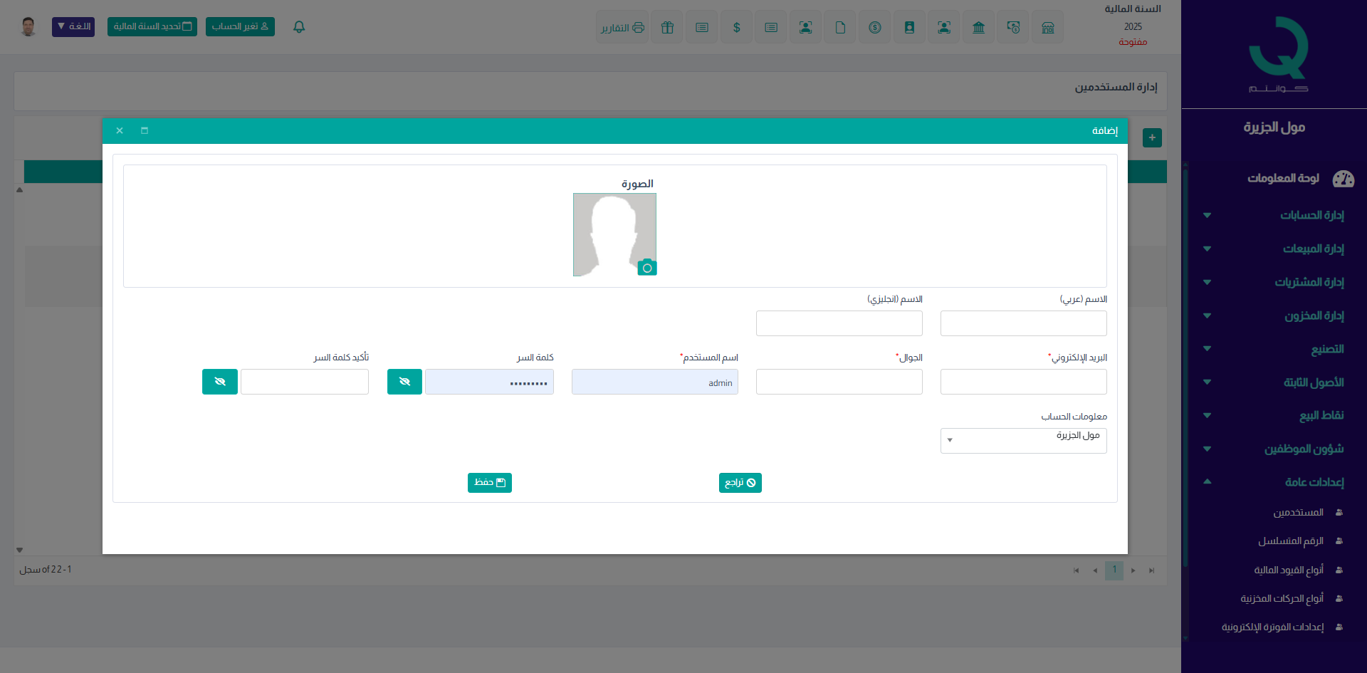 بالضغط على زر إضافة يتم فتح نموذج إنشاء مستخدم جديد.