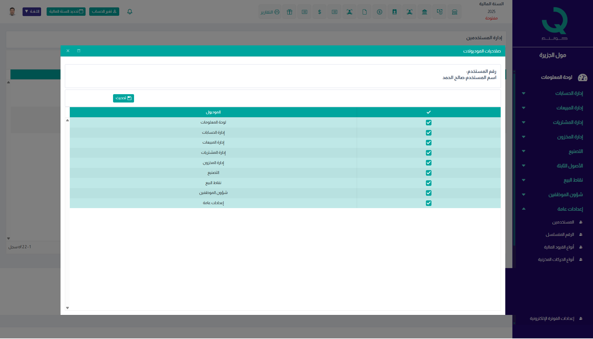 بعد تحديد الصلاحيات يتم الضغط على حفظ لتطبيق الصلاحيات على المستخدم.