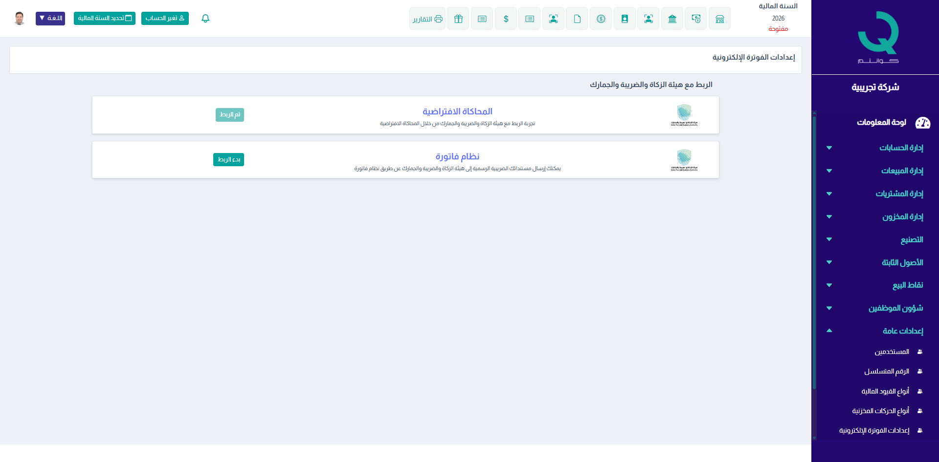 تتيح شاشة إعدادات الفوترة الإلكترونية ربط النظام مع منصات الفوترة المعتمدة من الجهات الرسمية، وإدارة إعدادات إرسال الفواتير الإلكترونية بشكل تلقائي ومتوافق مع الأنظمة.